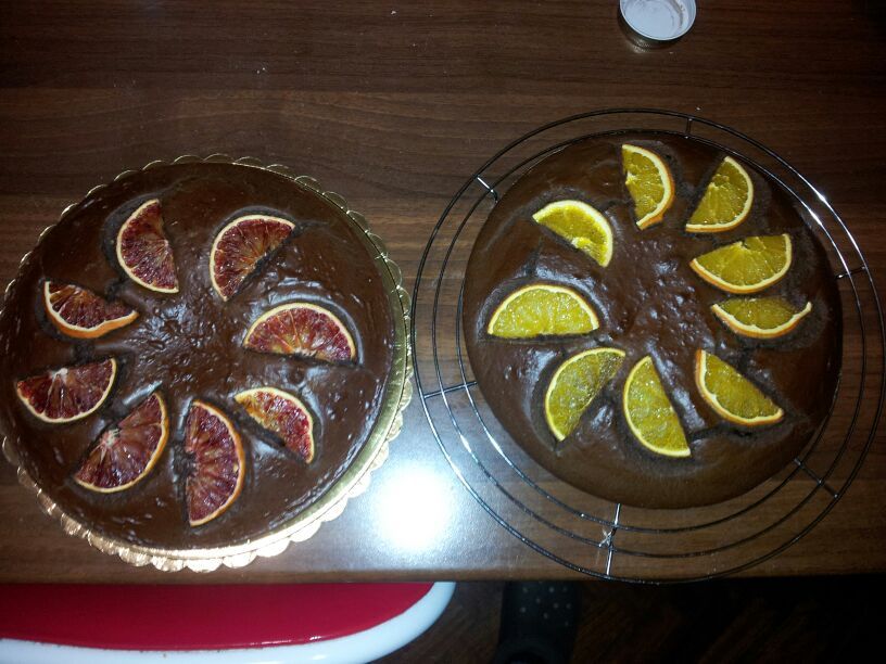 Mettete le uova, l'olio e la spremuta (compratevi tre arance e spremetele, cazzo!!! Non succo confezionato che è pieno di zucchero!!!!) in planetaria (o nello sbattitore...o se non ce l'avete usate una terrina e una frusta a mano) e sbattete per benino, il composto non monterà ma acquisterà comunque un po' di volume. Setacciate insieme tutti gli ingredienti secchi (farina, cacao e lievito) e incorporateli ai liquidi sempre sbattendo. Aggiungete un pizzico di sale. Fondete il cioccolato in microonde (o a bagnomaria, ma in microonde è meglio perchè il ciocco teme l'umidità dibbrutto quindi a bagnomaria dovete saperlo fare bene) e incorporatelo all'impasto. Imburrate e infarinate leggermente una tortiera, versateci dentro il composto. Tagliate a metà e poi a fettine sottili un'arancia e guarnite la torta disponendo gli spicchi a raggera. Infornate a 180°C ventilato per circa 20 minuti, fate la prova stecchino. Se fate la torta più piccola i tempi si riducono leggermente, se invece fate la dose che vi ho dato ma usate uno stampo più piccolo (quindi la fate più spessa) probabilmente ve ne serviranno 25.